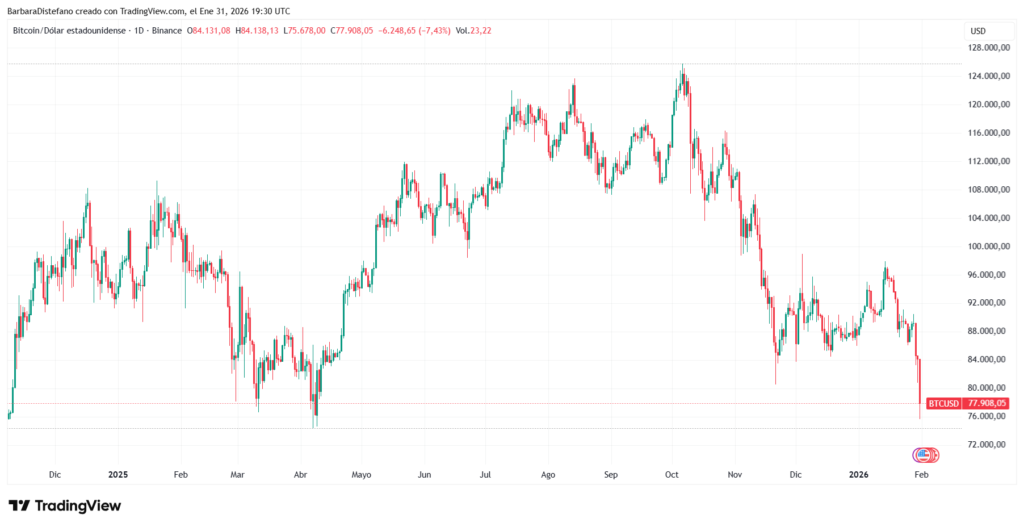 Tras la ruptura, bitcoin decayó rápidamente hasta los 75.000 dólares. Anterior a esto, bitcoin casi nunca había bajado de los 80.000, desde que superó este nivel por primera vez en la historia hace poco más de un año, en noviembre de 2024.