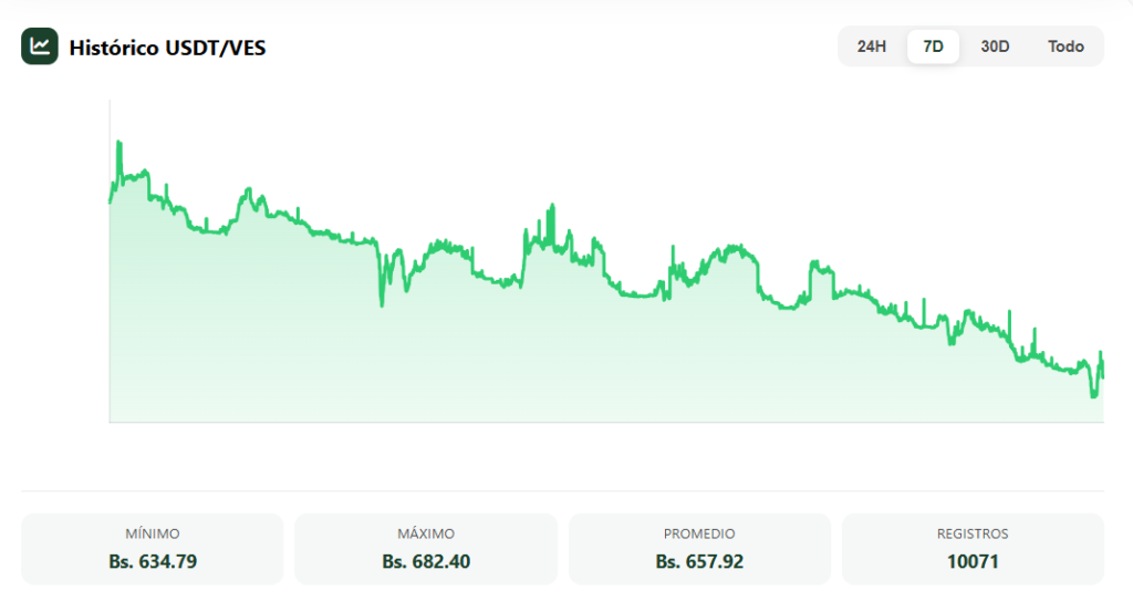 El precio de USDT en Venezuela ha caído más de 6,5% en los últimos 7 días. En ese período, pasó de 682 bolívares (moneda nacional venezolana) por USDT el pasado 28 de marzo a rondar los 634 al momento de redacción de este artículo, la mañana de este sábado 4 abril.