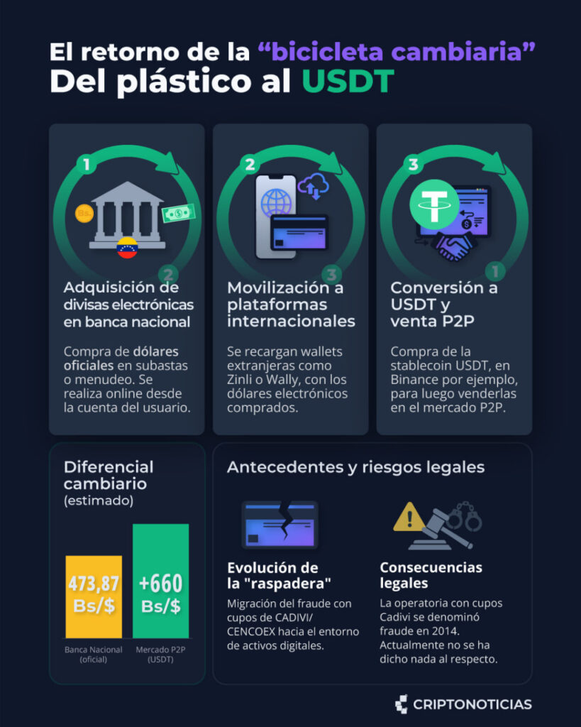 Esta caída en la cotización de USDT ha impactado directamente en lo que se conoce popularmente como la «bicicleta cambiaria», un fenómeno que aprovecha la disparidad entre las distintas tasas de cambio que conviven en la economía venezolana.