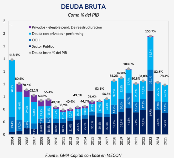 El año pasado, según datos de GMA Capital, la deuda bruta total de Argentina alcanzaba al 78,4% del PBI. De ello, el 17,1% tenía como acreedores a entidades multilaterales y el 26,8%, al mercado voluntario performing. En tanto el 34,5% es intraestado.