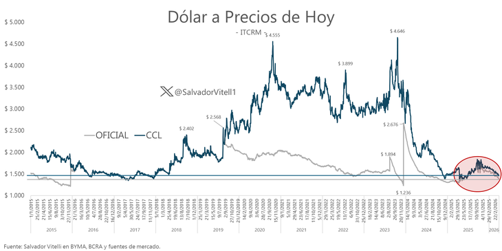 El economista de Romano Group, Salvador Vitelli, dio a conocer, a través de su cuenta de X, la evolución del TCRM desde principios de 2015, donde se observa que, ajustados a precios de hoy, el dólar oficial y el contado con liquidación (CCL) se ubican cerca del piso de 2017.