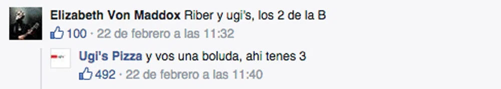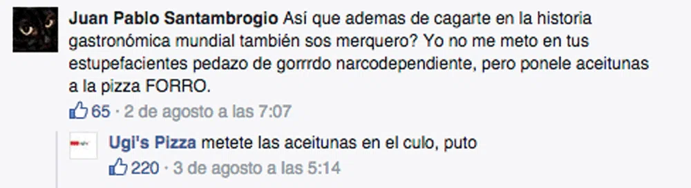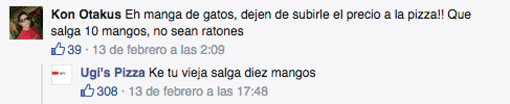 - Ugi’s: “¿Promo de qué, gordo? Sale 2 pesos la pizza, rata.”