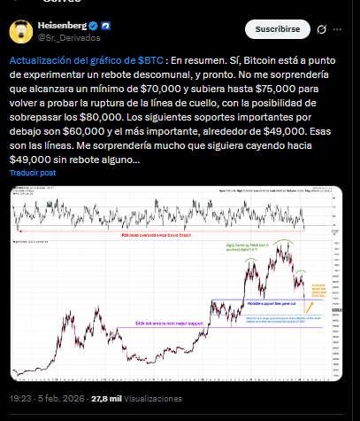 De manera similar, Katie Stockton, estratega técnica, proyectaba horas atrás que una ruptura decisiva por debajo de los 70.000 dólares —tal como ocurrió— llevaría el precio a 57.800 dólares antes de encontrar un soporte significativo.