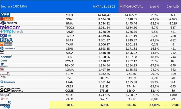 Según Tobias Sanchez, portfolio manager de Cocos Capital, el primer trimestre está siendo negativo para el equity argentino. “En lo que va del trimestre, la capitalización bursátil de las principales compañías locales cae cerca de 12% en dólares, mostrando una corrección bastante generalizada entre sectores”, explicó.