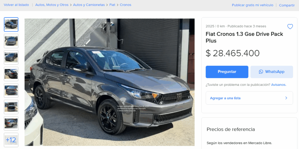 Precio de Venta al Público (PVP) del Fiat Cronos 1.3 Gse Drive Pack Plus: $28.465.400 (a julio de 2025, según la publicación de Mercado Libre).