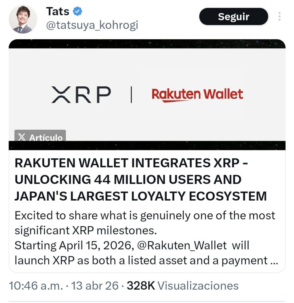 El gigante del comercio electrónico japonés, Rakuten, anunció la incorporación de XRP a su ecosistema de pagos a partir del 15 de abril de 2026, permitiendo a sus 44 millones de usuarios utilizar esta criptomoneda en más de 5 millones de comercios en Japón a través de la app Rakuten Pay.