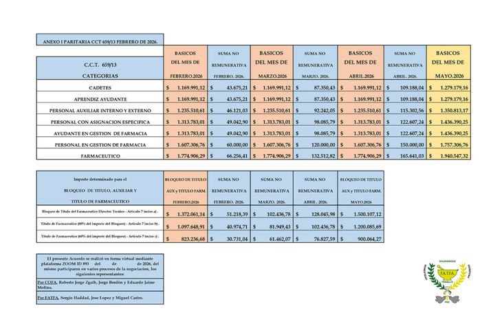 Por su parte, los trabajadores nucleados en la Asociación de Empleados de Farmacia (ADEF) aplican las escalas propias vigentes hasta marzo de 2026, con básicos para farmacéuticos que parten de $1.739.199,24 y con pisos garantizados para directores técnicos que no pueden ser inferiores a $3.016.399,50 en marzo.