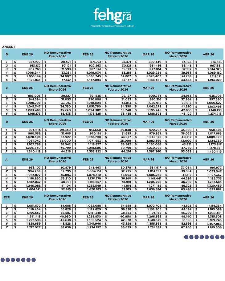 Los trabajadores hoteleros y gastronómicos encuadrados en el CCT 389/04, bajo el acuerdo firmado entre la Unión de Trabajadores del Turismo, Hoteleros y Gastronómicos de la República Argentina (UTHGRA) y la Federación Empresaria Hotelero Gastronómica de la República Argentina (FEHGRA), perciben en marzo de 2026 los salarios básicos resultantes de los tramos de aumento aplicados desde octubre de 2025 hasta este mes.