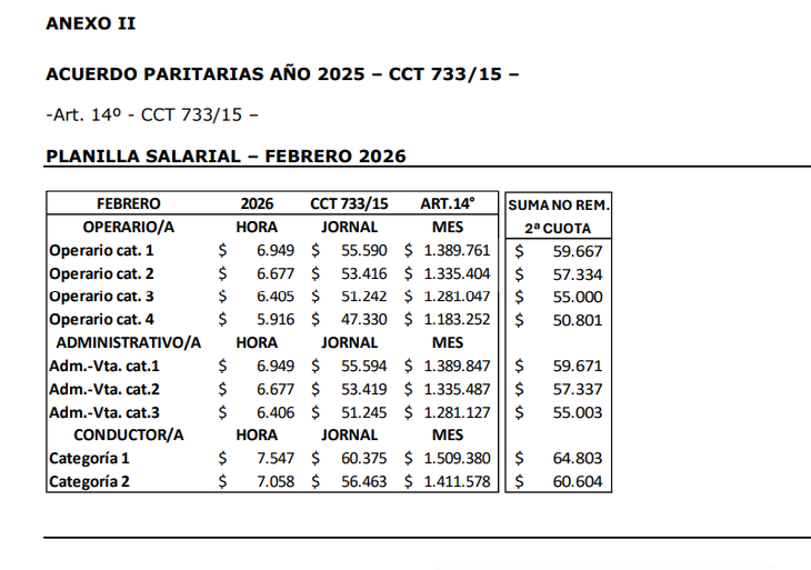 La paritaria estableció un aumento acumulativo del 14%, aplicado en tramos entre octubre y marzo, junto con sumas fijas no remunerativas mensuales que, en total, alcanzan los $160.000 distribuidos en cuotas. Para aquellas empresas que aguardaban la homologación, los importes adeudados se liquidan de manera retroactiva y en un solo pago.