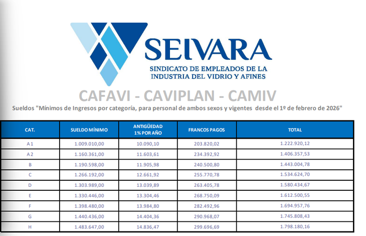 En el mes de febrero a cobrarse en marzo, las escalas salariales de la industria del vidrio van desde los $1.222.920,12 para la categoría A1, mientras que la H cobrará un total de $1.798.180,16 más bonificaciones de hasta 15% por título terciario no universitario y del 20% por títulos universitarios.