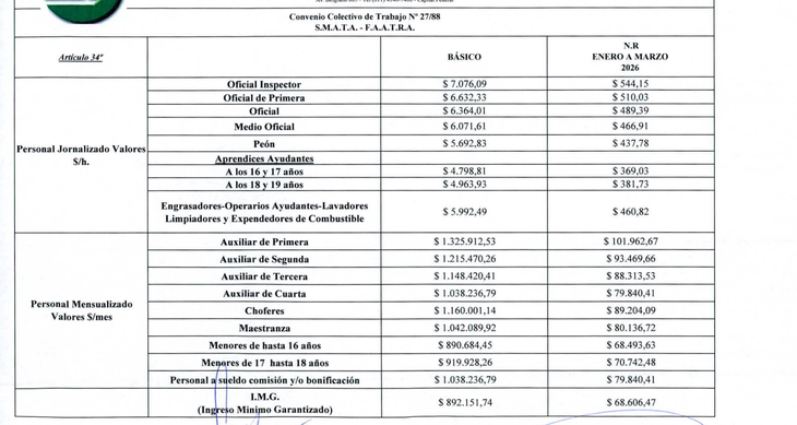 En marzo, los trabajadores mecánicos perciben un ingreso mínimo garantizado de $892.151,74. El personal mensualizado —ya sea a sueldo, comisión o con bonificaciones— alcanza un haber de $1.038.236,79, mientras que un auxiliar de primera cobra $1.325.912,53.